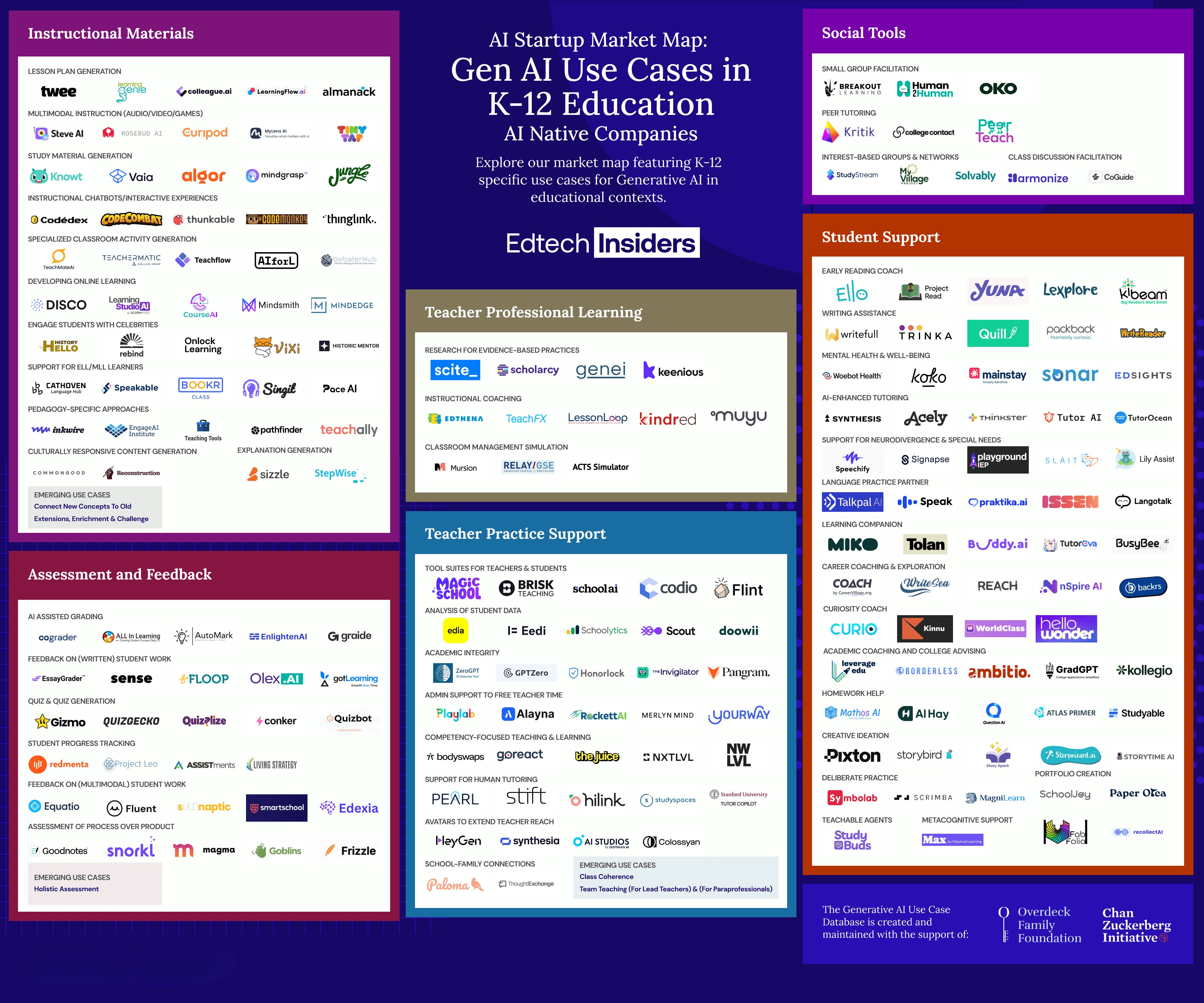 Previously, companies were mapped to a single primary use case. That framing increasingly breaks down as incumbents expand AI horizontally across products. Many now serve multiple instructional and operational needs using a shared AI foundation. By contrast, many AI-native startups remain intentionally focused on narrower, specialized problems — a dynamic better captured in the separate startups map.